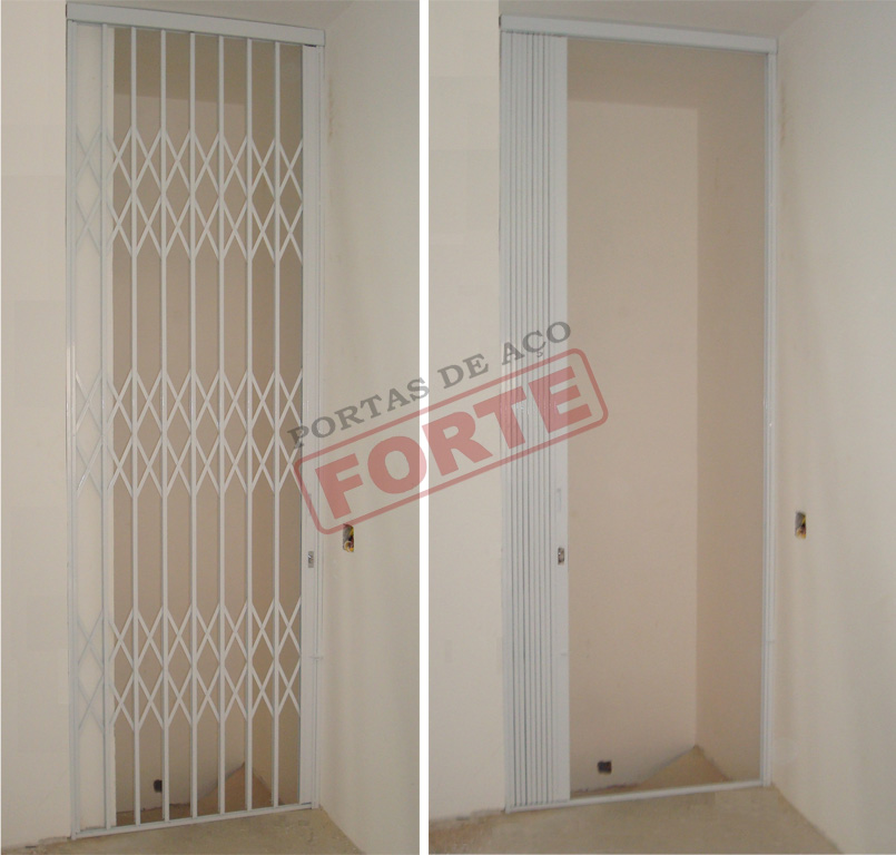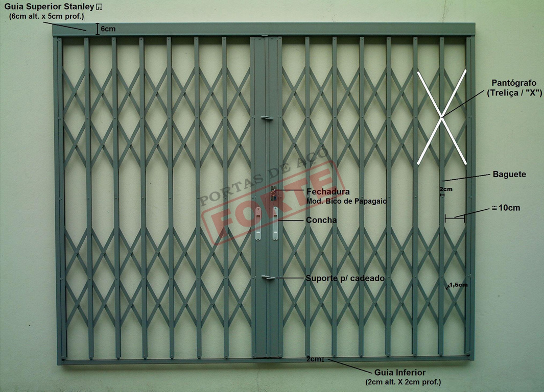 Possui requadro metálico, tendo sempre um trilho superior para os rodízios, um trilho inferior fixo (proeminente ou embutido no piso) ou móvel (dobrável), fechadura Mod. bico de papagaio e acabamento em pintura eletrostática, com várias opções de cores. As Portas Pantográficas confeccionadas pela empresa Portas de Aço Forte apresentam materiais de alta qualidade, resistência e durabilidade, sendo essencialmente utilizadas para proteção de ambientes, constituindo um recurso de segurança com pouca interferência na estética do vão, já que seu um modelo retrátil e vazado permite a otimização deste espaço.